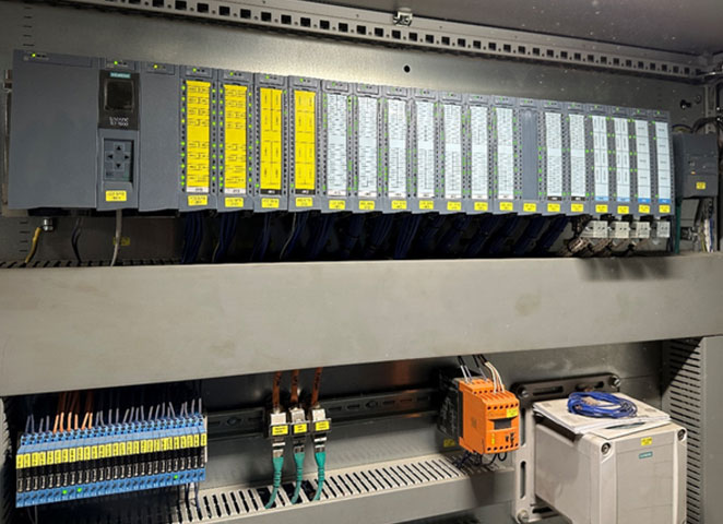 Το έργο μας περιλάμβανε ολόκληρη την ηλεκτροτεχνική υλοποίηση, συμπεριλαμβανομένου του σχεδιασμού υλικού στο Eplan P8, της δημιουργίας λογισμικού στο TIA Portal, καθώς και της κατασκευής και εγκατάστασης των πινάκων ελέγχου.